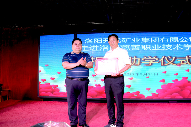 集團(tuán)副總經(jīng)理?xiàng)畲荷砺尻栭_元礦業(yè)集團(tuán)向洛陽慈善職業(yè)技術(shù)學(xué)校捐贈新生校服西裝,洛陽慈善職業(yè)技術(shù)學(xué)校賈國彪校長為洛陽開元礦業(yè)集團(tuán)有限公司頒發(fā)榮譽(yù)證書,并向全校師生展示新校服。